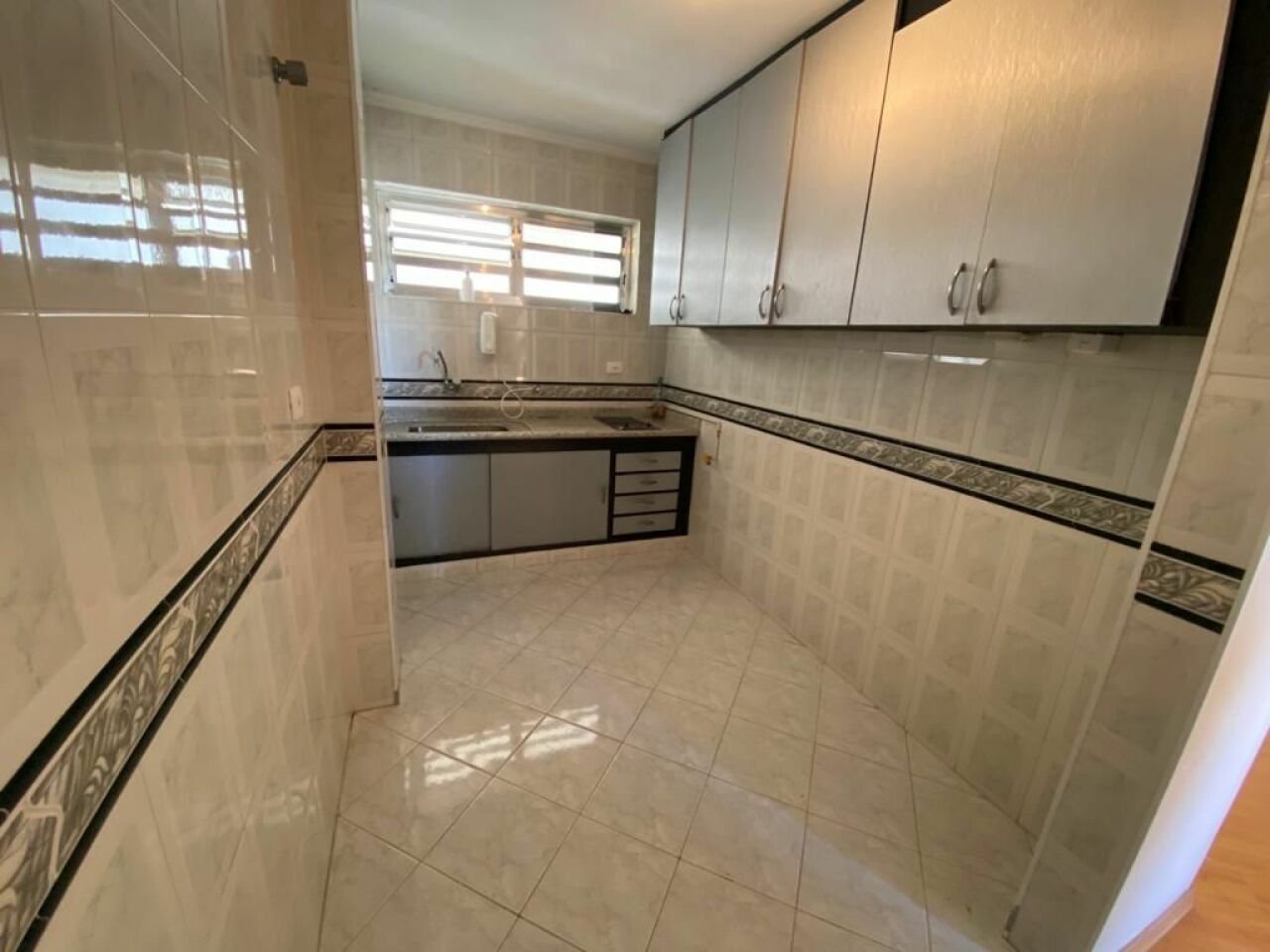 Apartamento com 42 m² de área útil, com sala, cozinha com armarios, um dormitório com armario, e garagem para um veiculo.