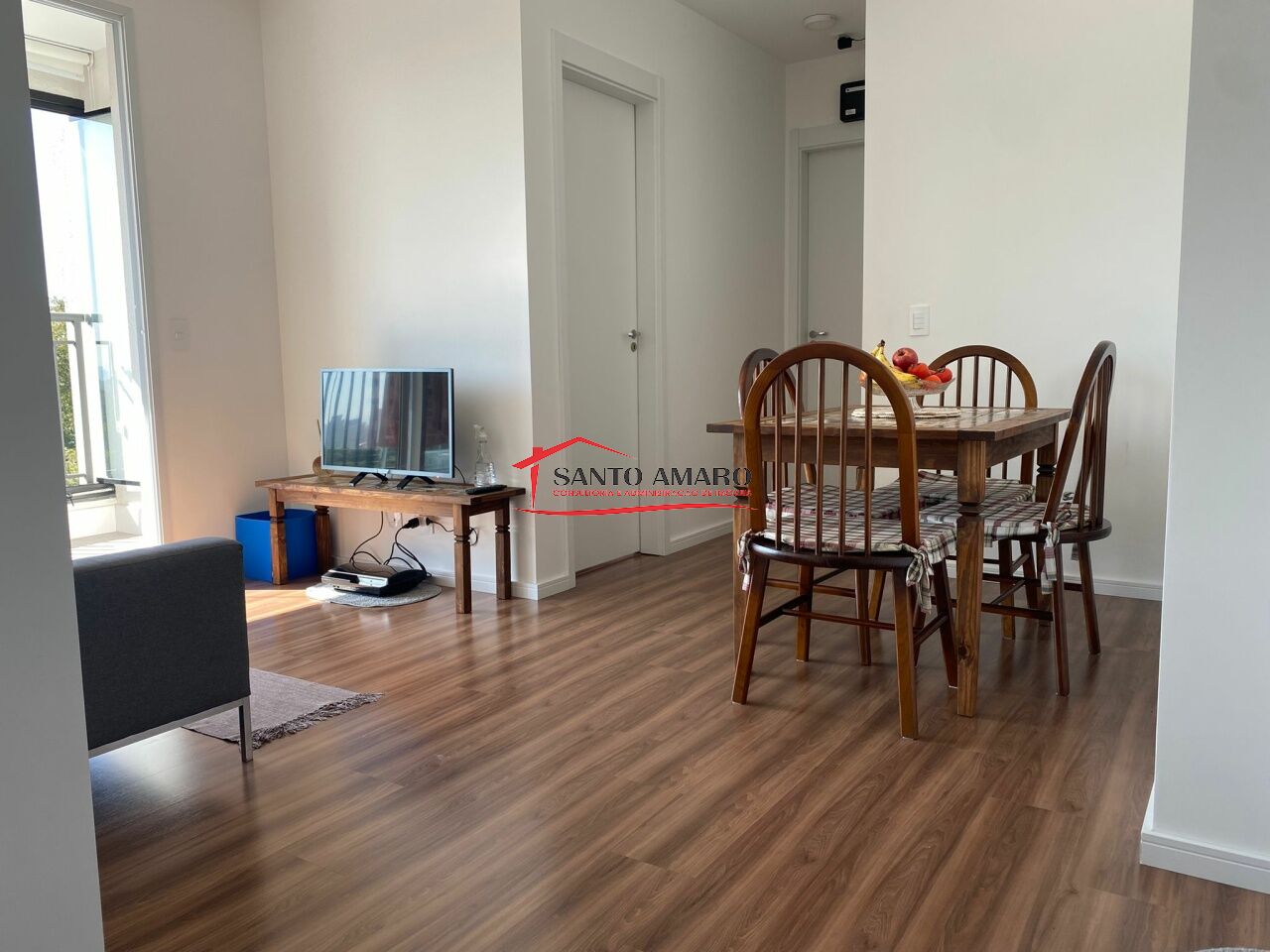 Apartamento com 56 m² de área útil, Sala com terraço fechado com vidros, cozinha e área de serviços, 2 dormitorios, banheiro social, garagem com 2 vagas para veiculos.