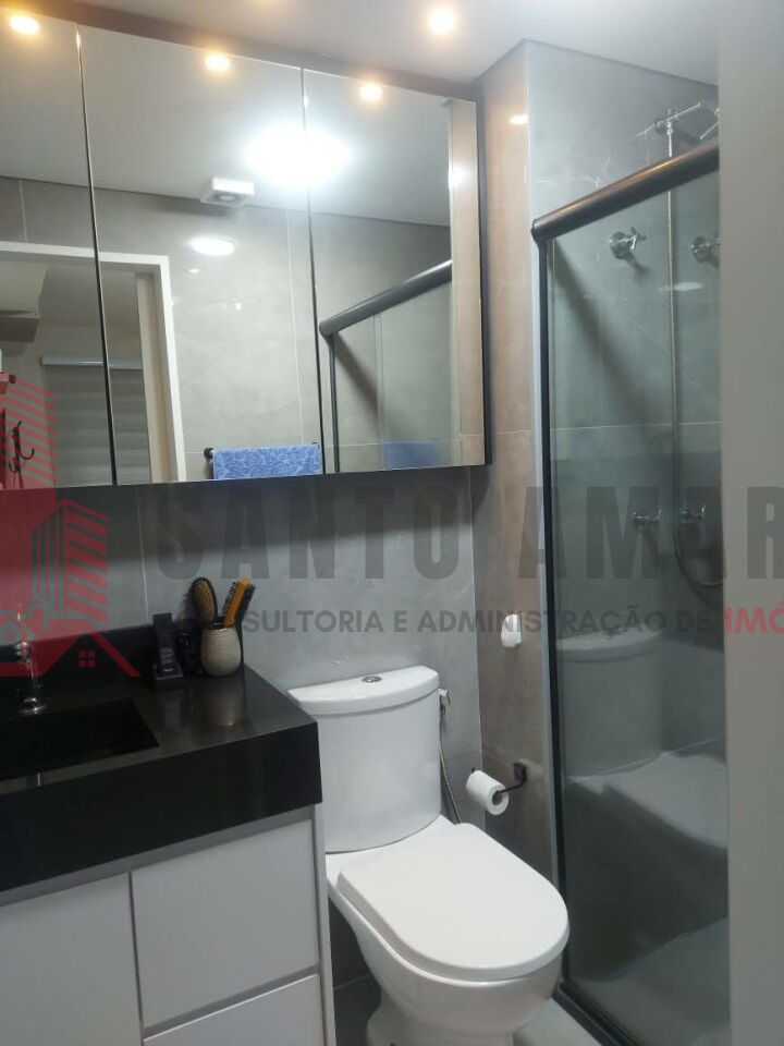 Banheiro social com dispensa planejada na área do box.